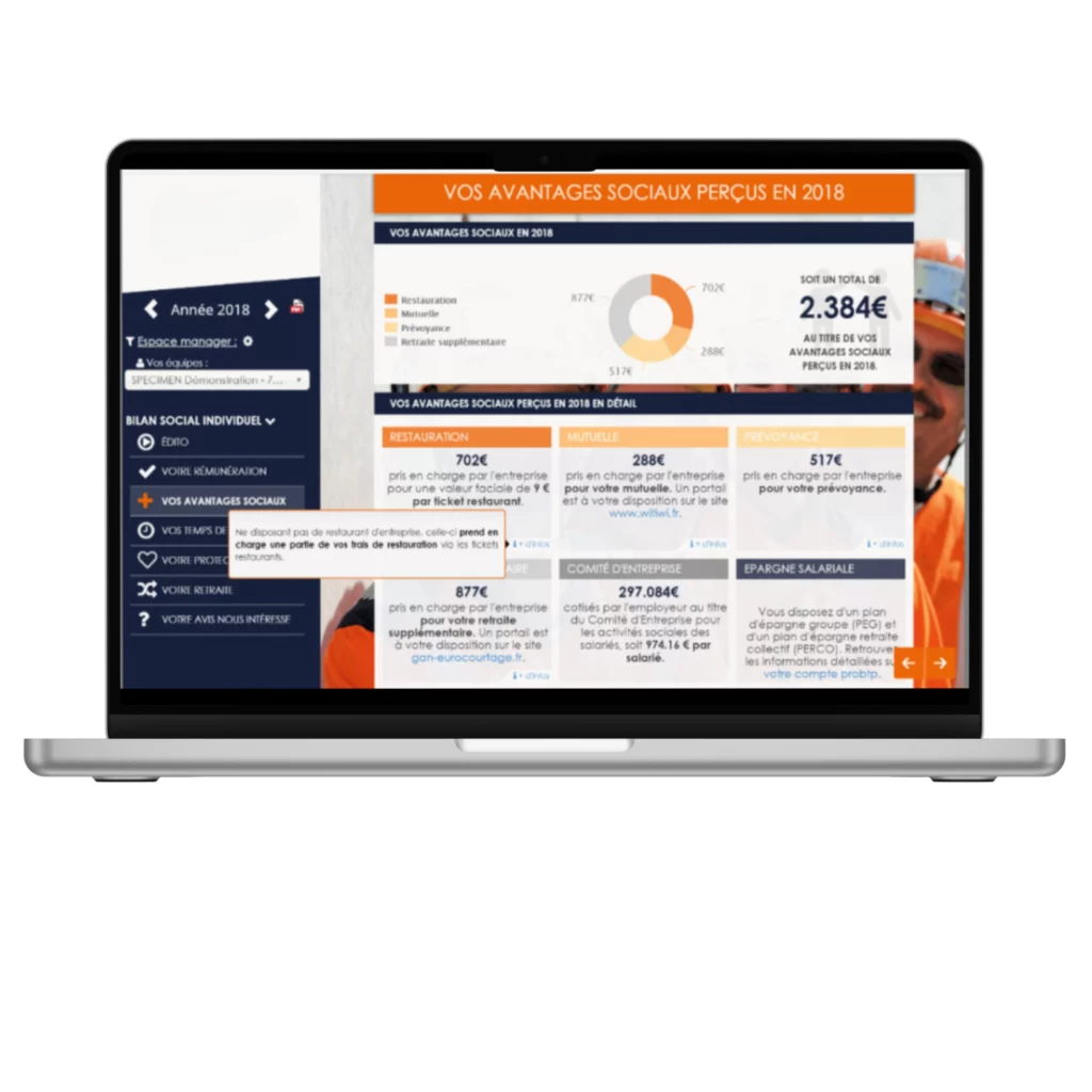 Interface intuitive pour les salariés, une fluidité de navigation à travers les différents onglets proposés: rémunération, temps de travail, avantages sociaux...